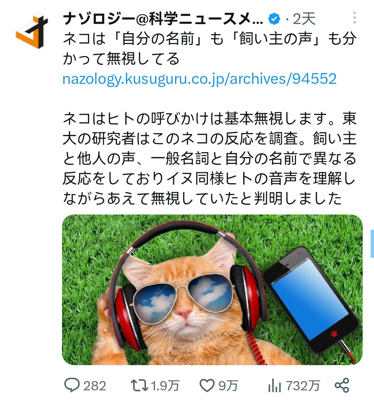 ナゾロジー@科学ニュースメディア(Nazology科学新闻媒体)发表了一篇普通的科普文章,但却吸引一堆人分享“猫猫”“猫基本会无视人类的呼唤。东京大学研究者针对猫的反应进行调查,发现它们对主人与他人的声音、一般名词与自己名字的反应存在差异。研究表明猫与狗类似,虽能理解人类语音却故意选择无视”