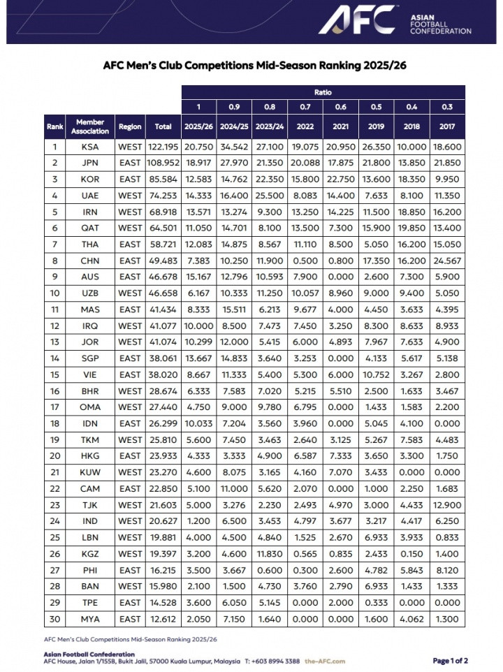 2025/2026赛季亚足联男子俱乐部赛事中期排名榜(前10):